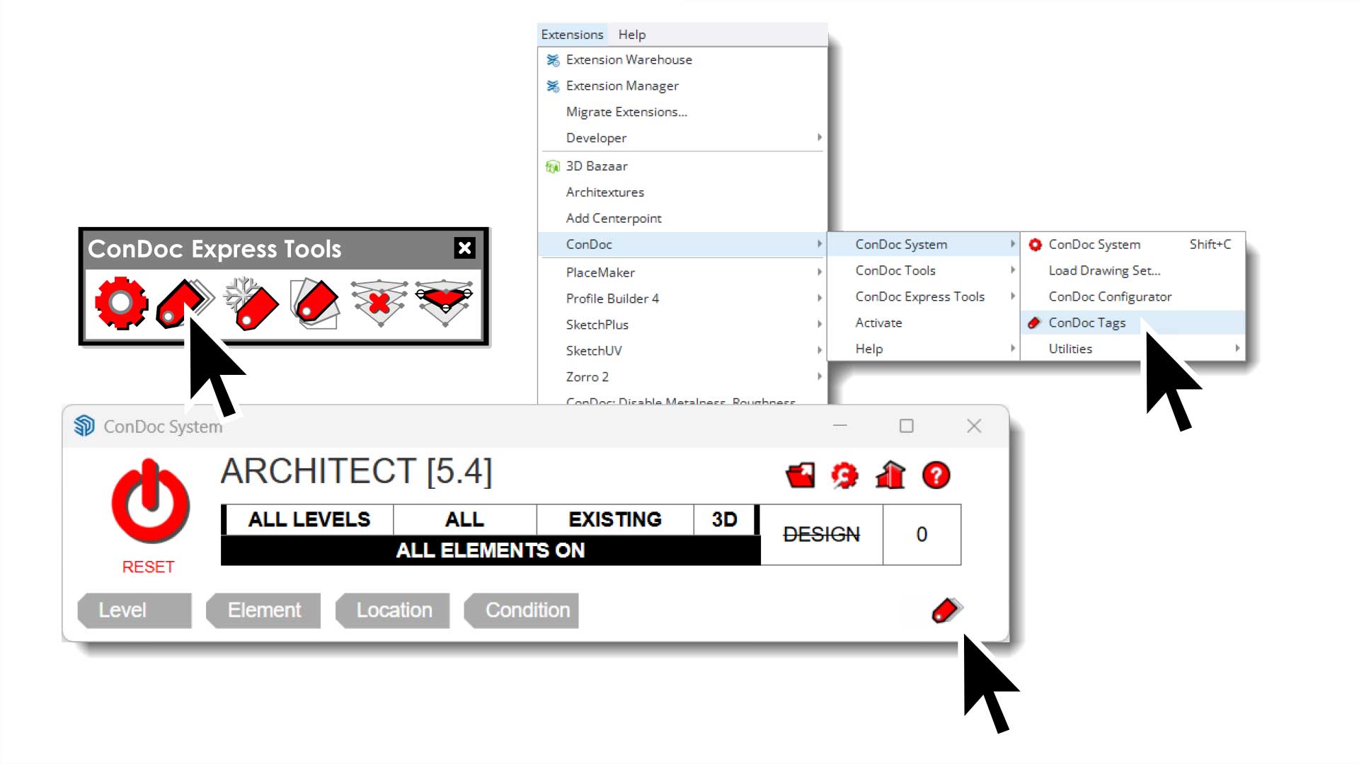 When you install the ConDoc Tools extension, two toolbars are added to SketchUp: the ConDoc Drawings Toolbar and the ConDoc Express Tools Toolbar. Together, these toolbars give you all the tools you need to generate, manage, and clean up your ...