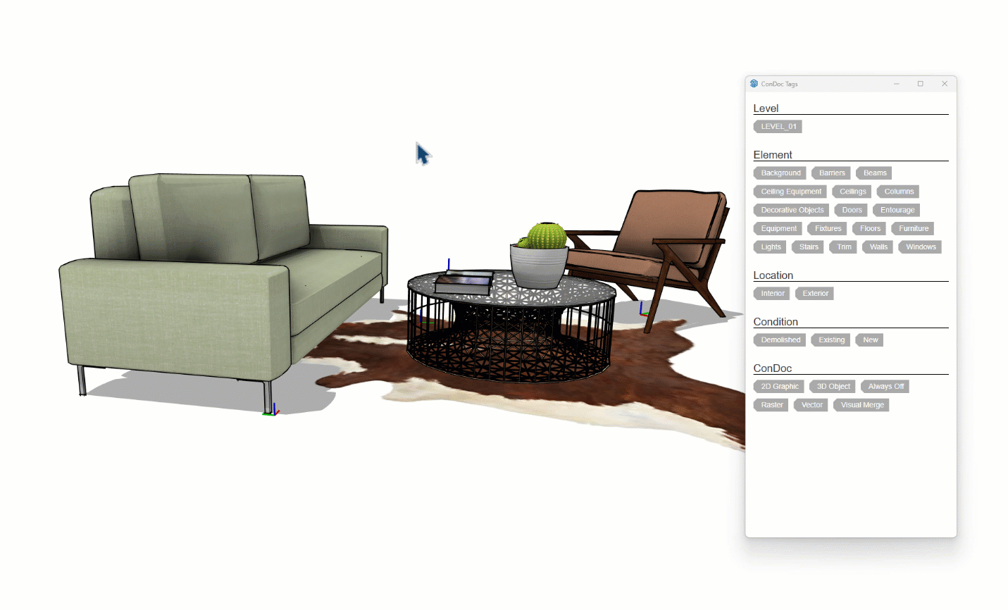 Multiple ConDoc tags can be assigned to one entity—no nested groups required.Any designed space—interior, architectural, or landscape—can be described using four core attributes:
