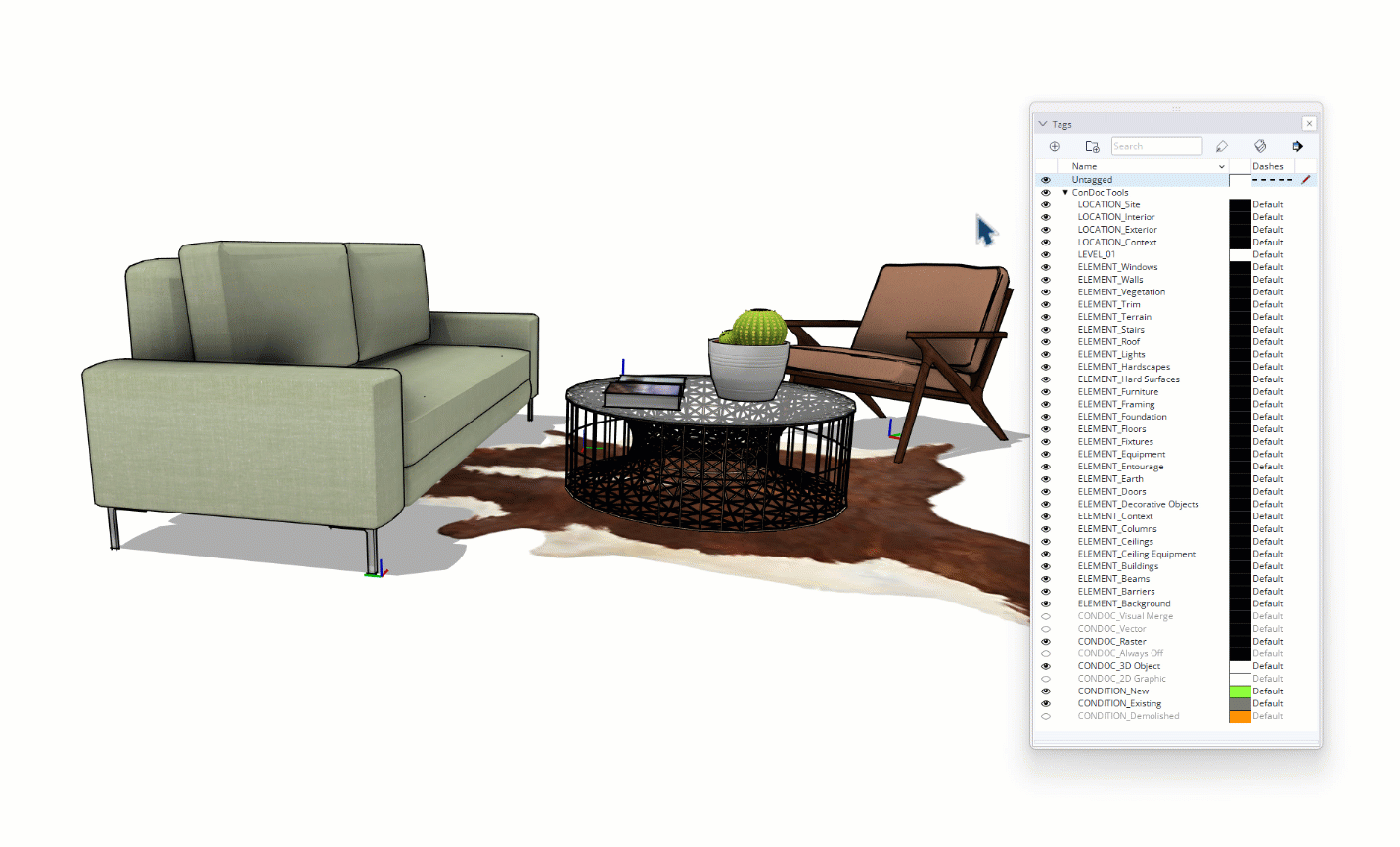 Within the SketchUp Tags dialog, you’ll find a tag folder called ConDocTools. All ConDoc Tags appear here. When you toggle visibility for a tag off in the SketchUp Tags dialog, any entity assigned that tag in ConDoc will be hidden.