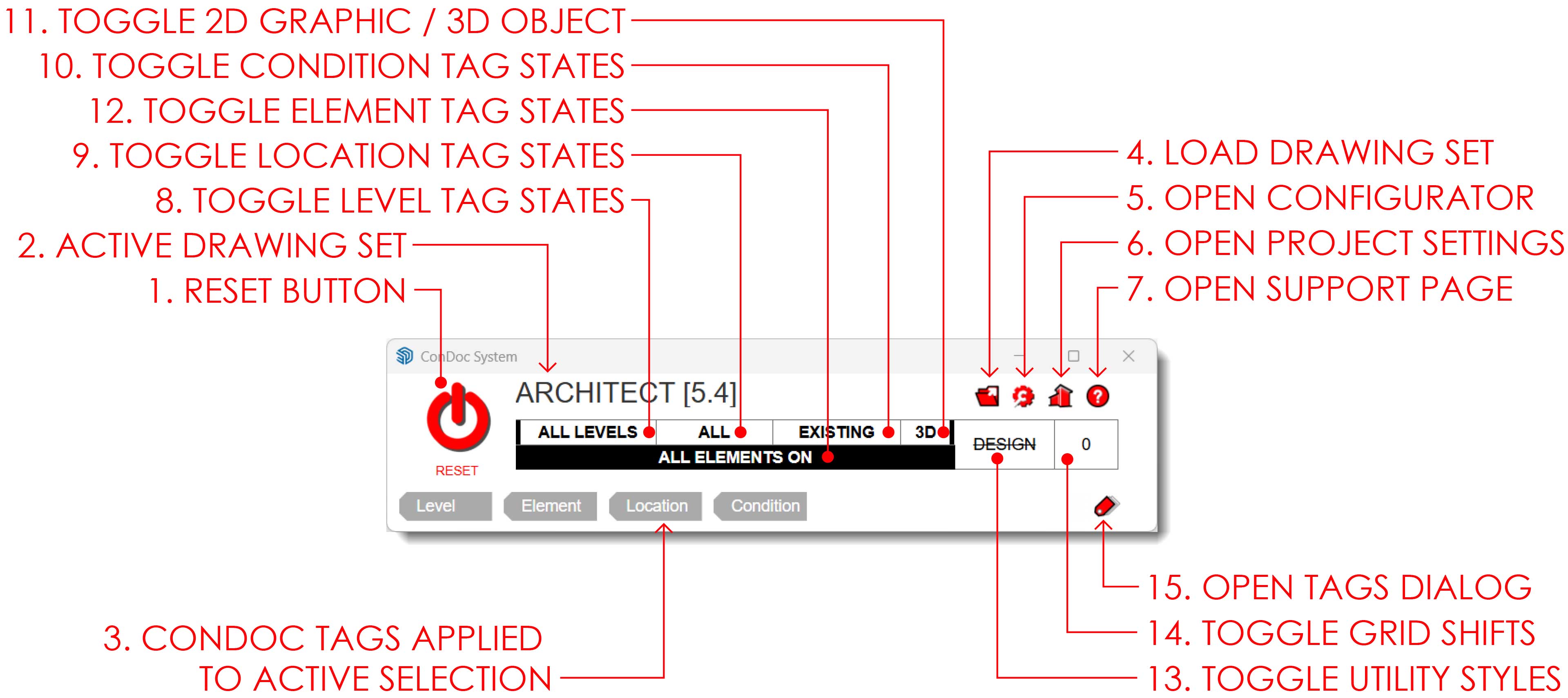 Unlike the LEVEL and LOCATION tag toggles, this one doesn’t cycle through individual elements—there are simply too many to manage that way. Instead, it’s designed to work in conjunction with the ELEMENT Tag Freeze and ELEMENT Tag Isolate tools found on the ConDoc Express Tools Toolbar.